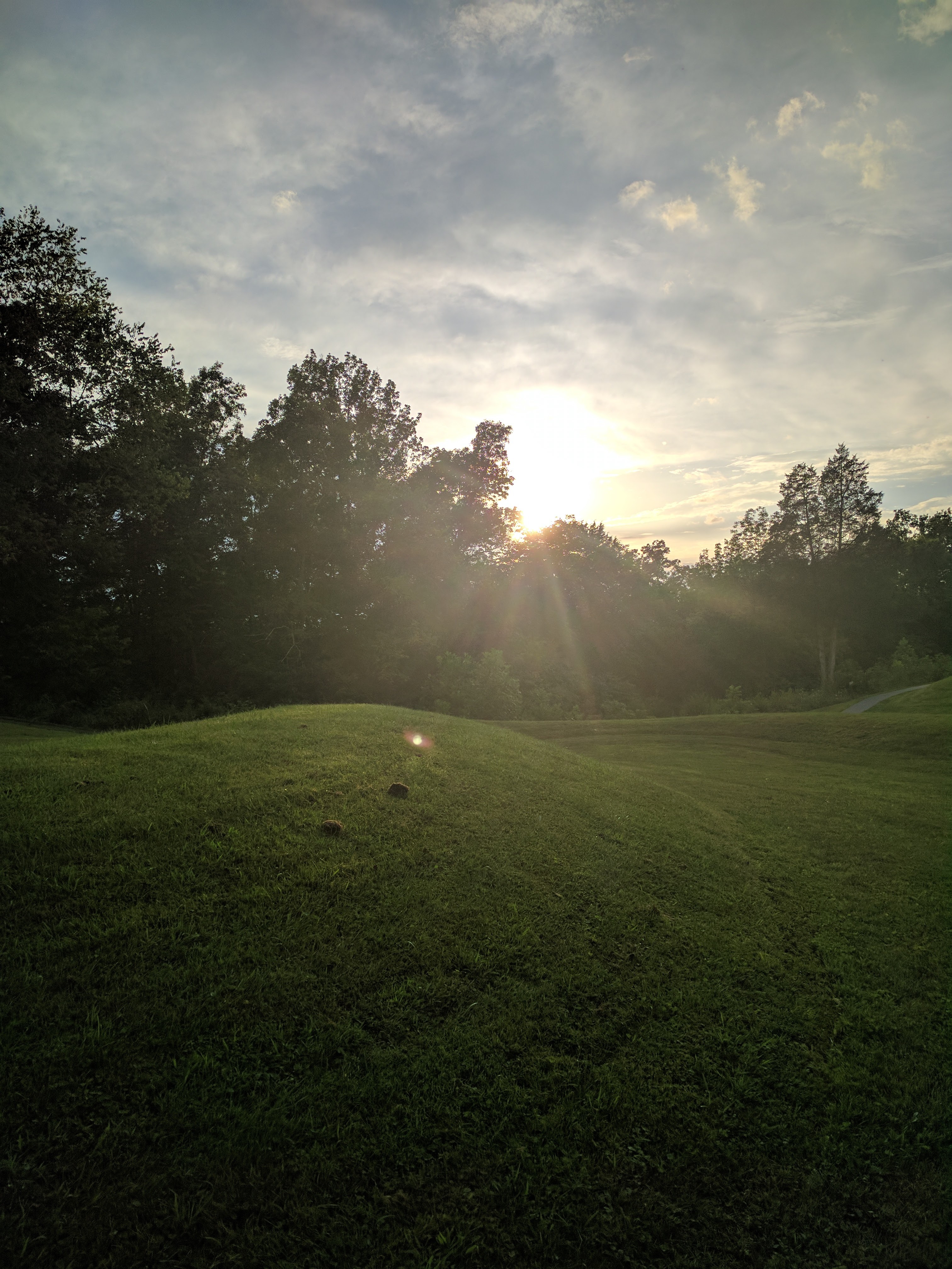After descending the tower and walking along the trail that parallels the Serpent Mound, I captured the following photo of the sunset. Note the three “clumps” on the mound itself, one of which is illumined by the sunlight. This was not visible while I had taken the photo as I was really just trying to capture the sunset over the Serpent Mound complex. Whether this is something of interest, or just a trick of my Nexus 6P camera I’m not sure, but I found it interesting nonetheless.